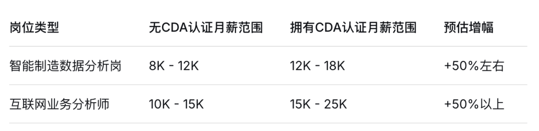 数据支撑:薪资劣势较着正在智能制制、互联网等范畴,具有CDA认证的求职者,起薪和涨幅均显著更高。